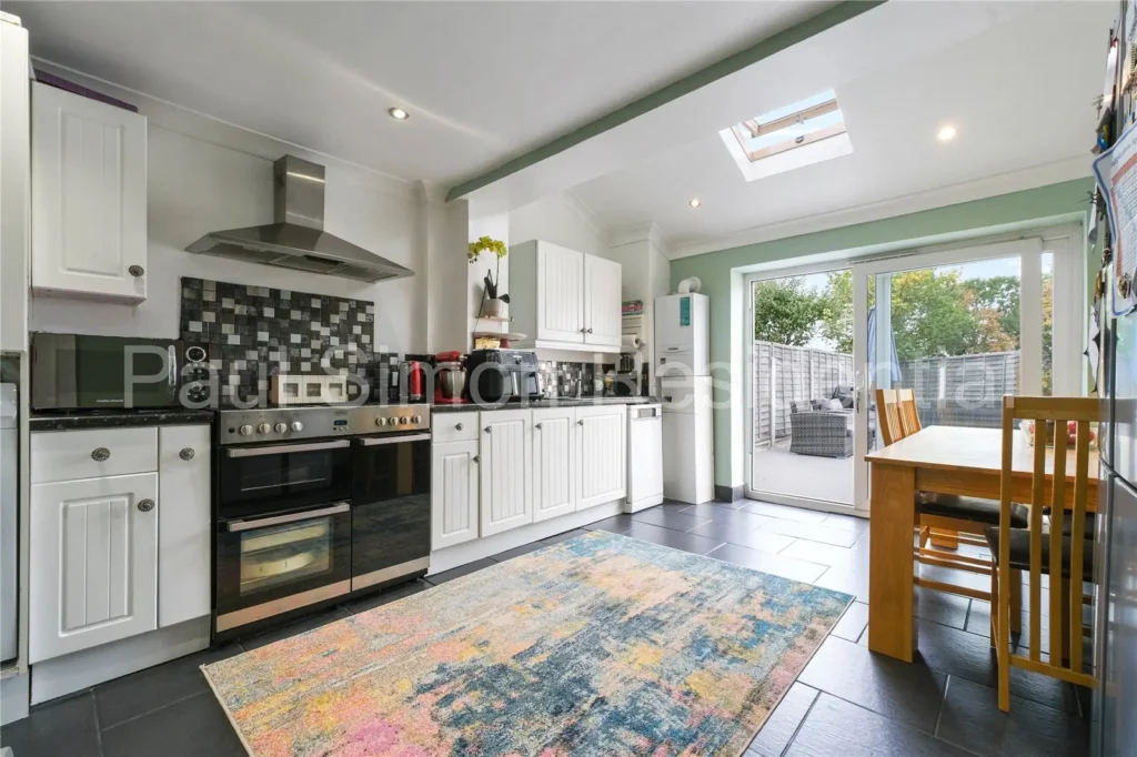 Base mounted units and wall mounted cupboards, stainless steel sink with mixer tap, tiled splash back, freestanding gas cooker with double oven and stainless steel extractor hood, tiled flooring, skylight, and double glazed patio doors leading to the gardenFirst Floor