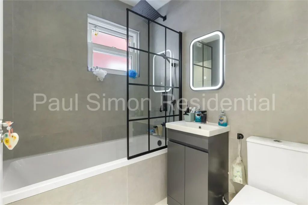Panel bath with shower attachment and shower screen, wash hand basin with mixer tap, window, low level flush wc, tiled walls and flooring.Bedroom