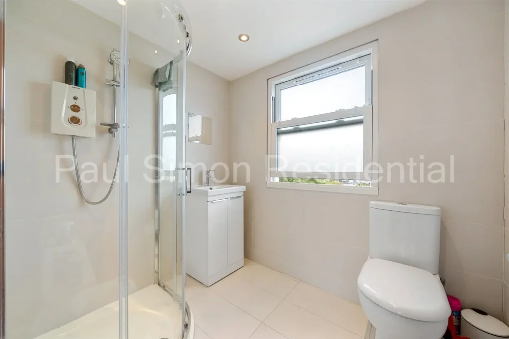 Corner electric shower with shower attachment, tiled flooring and walls, vanity unit with wash hand basin, low level w.c and double glazed sash window to rear aspect.Bedroom Five