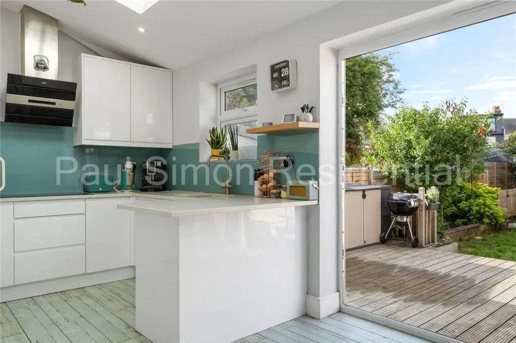The mature rear garden offers a tranquil setting with a decked entertaining area and potential to add a garden office, enhancing the home’s flexibility.