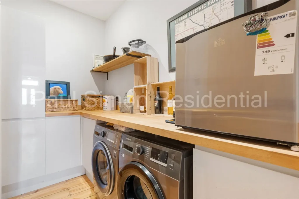 Exposed wooden floors, radiator and double glazed bay window to front aspect with fitted shutters.Utility Room