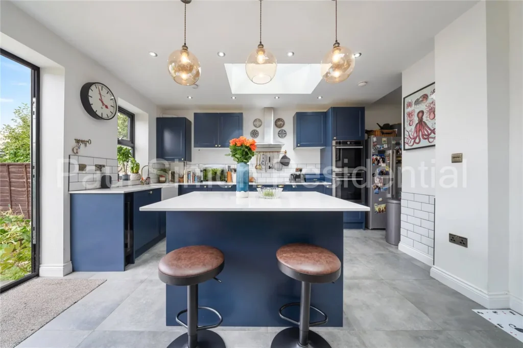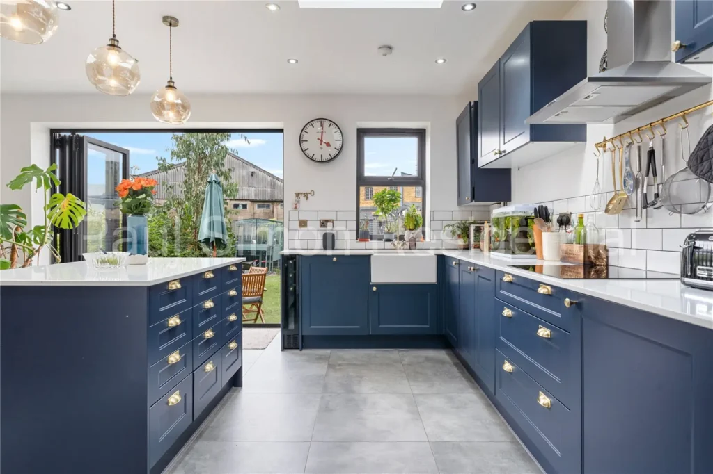 Shaker cobalt blue base mounted units and wall hung cupboards, white quarts worktops, double glazed window to rear aspect, tiled flooring, designer wall radiator, butler sink with gold mixer tap, integrated wine rack, electric twin oven, induction hob with extractor, metro tiled splash backs, two roof lanterns, LED spot lights, space for double fridge freezer and combination boiler. Double galzed bi-folding doors to rear garden.First Floor: