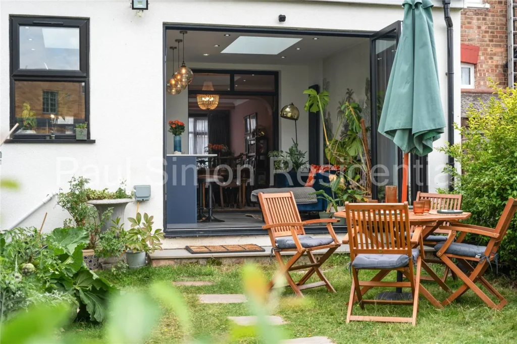 Upon entry, you're welcomed by a practical porch and an impressively wide hallway, setting the tone for the home’s generous proportions. Elegant Crittall-style double doors lead into a bright and spacious through-lounge, featuring herringbone wooden flooring and sophisticated wall panelling. Both the hallway and reception room flow directly into a stunning rear extension — a show-stopping kitchen/dining room complete with integrated appliances, a central island, and flooded with natural light via two roof lanterns and expansive bi-folding doors.