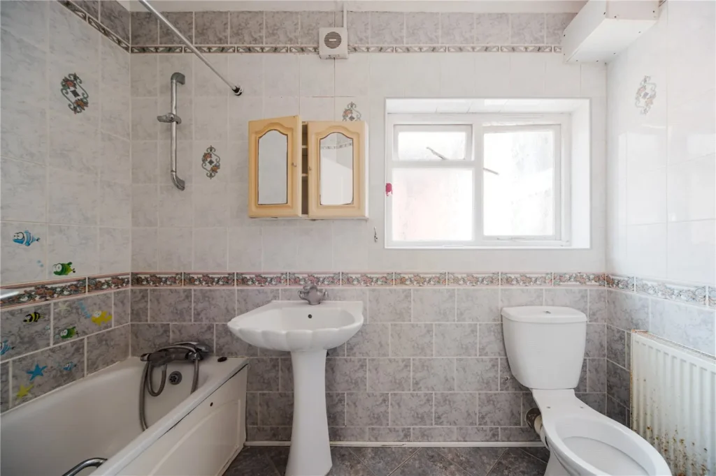 Panel bath with shower attachment, low level flush wc, wash hand basin with mixer tap, windows, radiator, tiled walls and flooring.Bedroom two