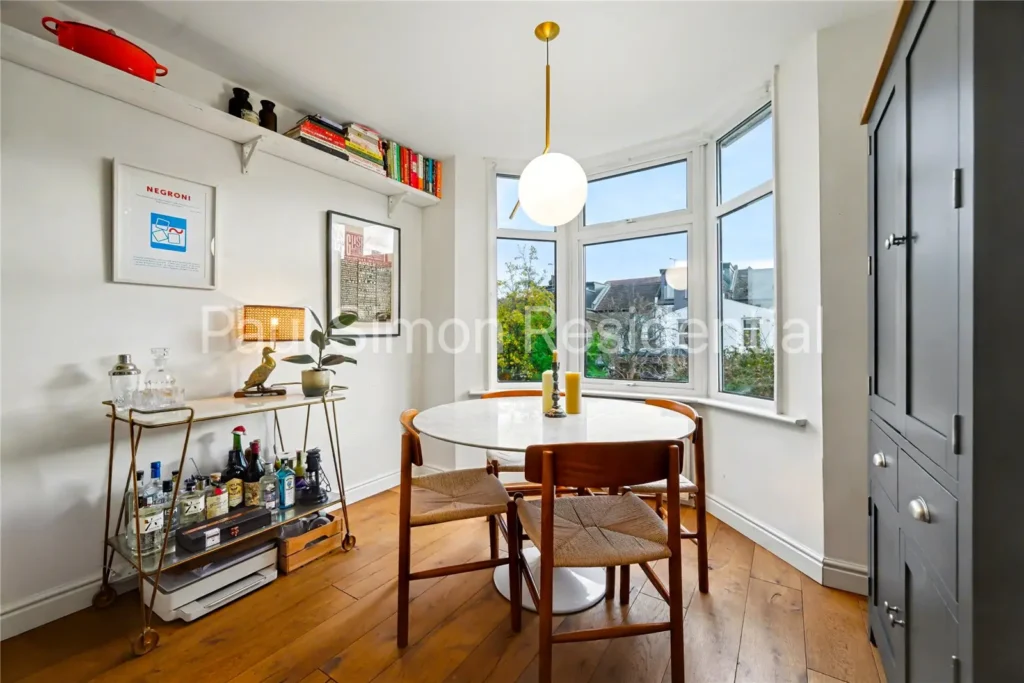 The bright and contemporary kitchen-diner, complete with modern integrated appliances, opens up via a pull-down ladder to the roof terrace, offering seamless indoor-outdoor living. A stylish main bathroom and an elegant reception room with period detailing complete the space.