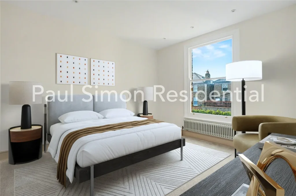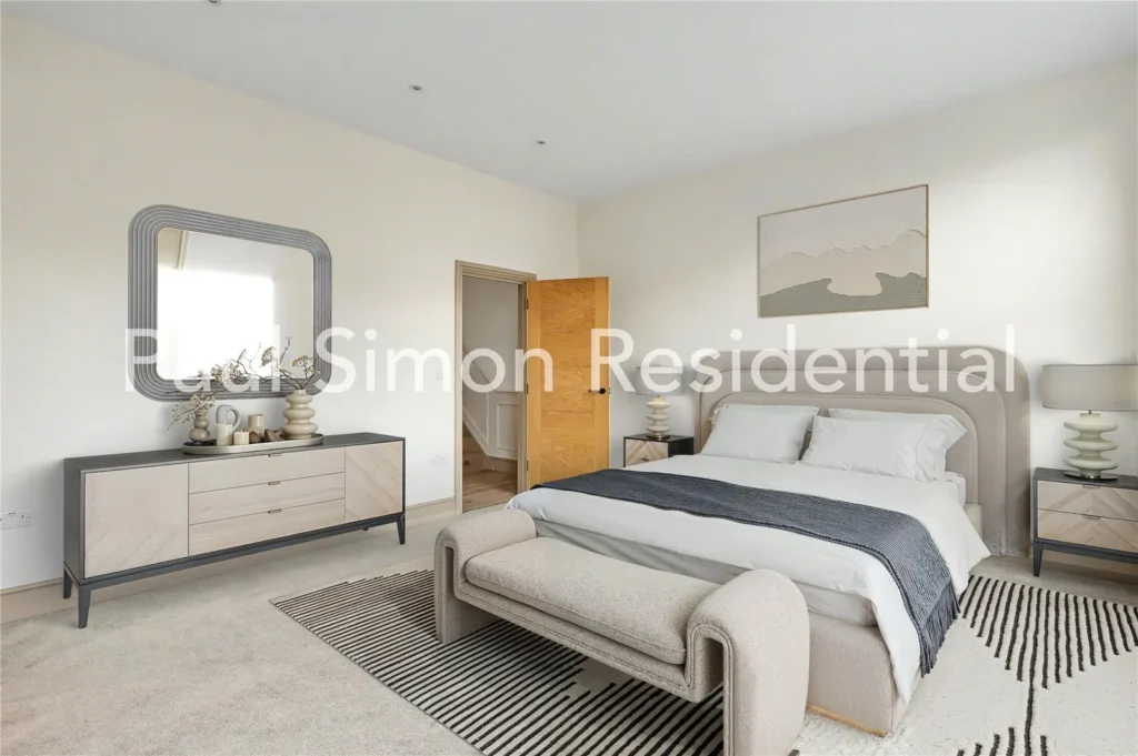 The second floor continues the sense of space, offering two further bright and well-proportioned double bedrooms, ideal for a growing family or home working arrangements. A second contemporary bathroom completes this level, featuring a bathtub, shower, and modern, tasteful finishes.