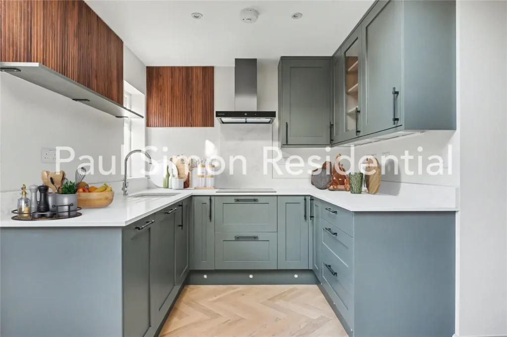 To the rear, the contemporary kitchen has been thoughtfully designed with stylish cabinetry, ample worktop space, and integrated appliances. Crittall-style doors open directly onto a private south-facing garden, providing a quiet outdoor retreat perfect for alfresco dining, children’s play, or unwinding in a leafy environment. This level also includes a guest WC.